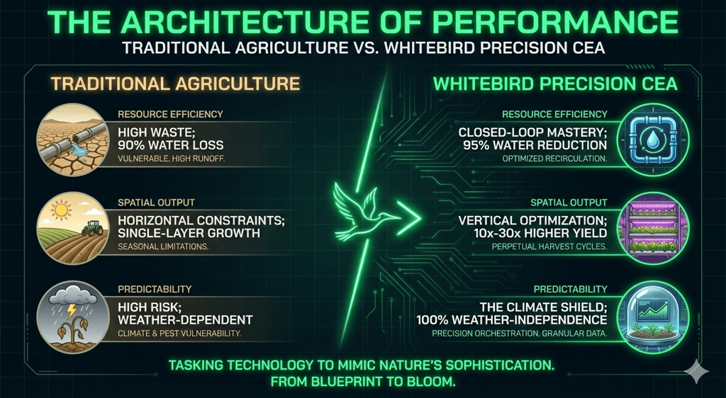Water Efficiency: CEA (specifically hydroponic/vertical systems) uses 90–95% less water than traditional field farming.